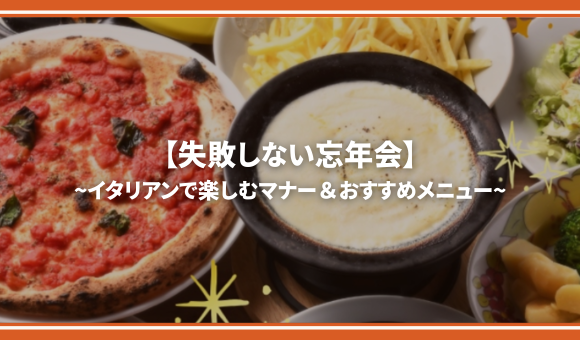 本記事では、忘年会の意味や楽しみ方、押さえておきたいマナーを解説します。さらに、忘年会で人気のあるイタリアンメニューや、会場選びのポイントもご紹介します。イタリアンでの忘年会をより快適に楽しむためのヒントをまとめました。 ぜひチェックしてみてください。 【この記事